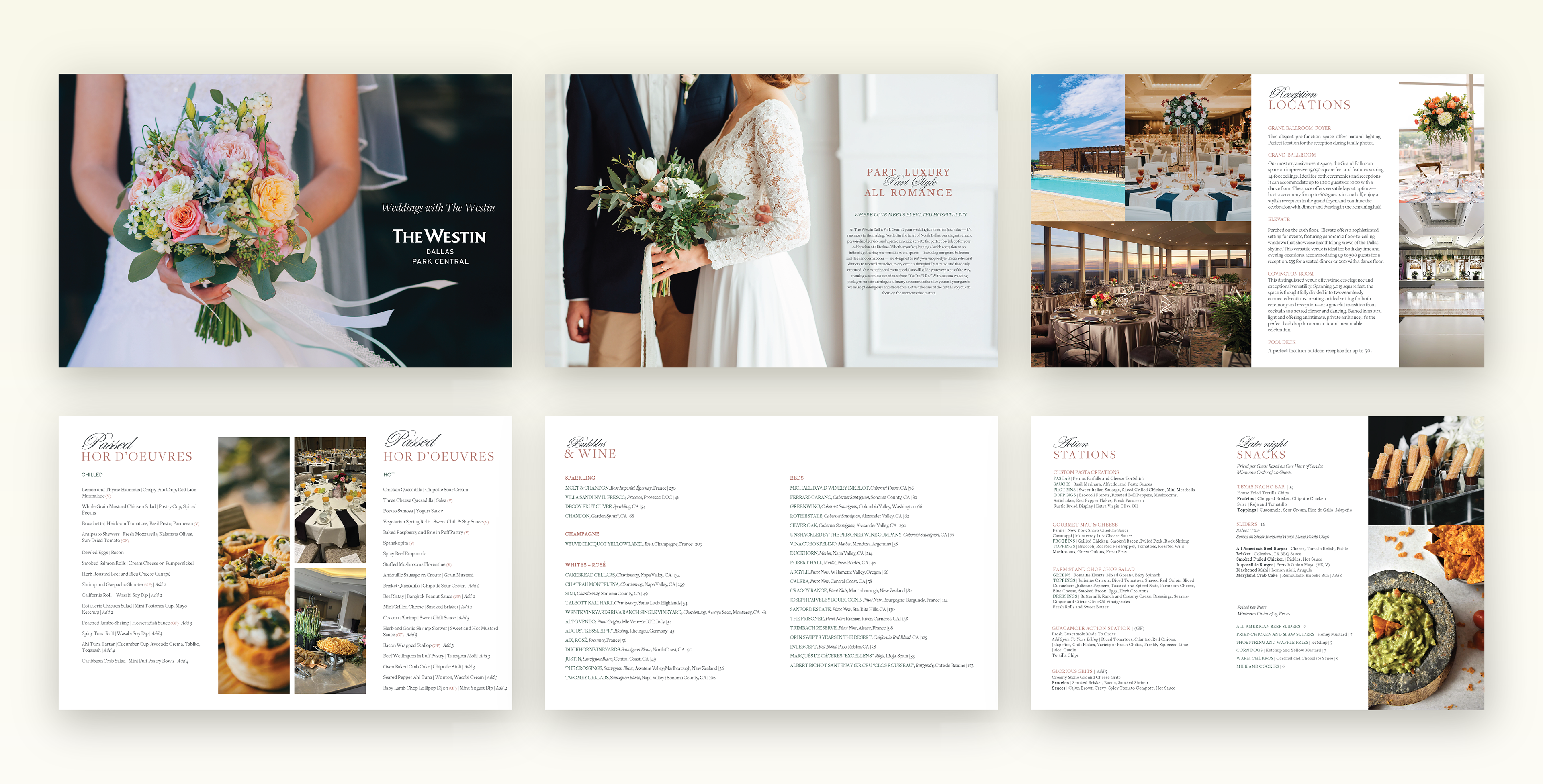 A wedding menu for The Westin Dallas designed with a table of contents with links to each section. This menu is 18 pages and features the hotel's ceremony and reception packages, event locations, dinner and bar options, and more.