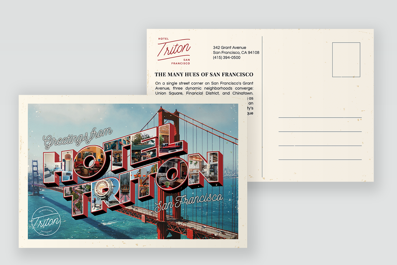 Throughout the years I've made several versions of a vintage style greetings postcard for hotels, and as of 2026 have made maybe six in total. Balancing the images so that the background isn't too busy and obscures the text can be a challenge (but what the client wants is what the client gets!) and some have turned out better than others. The most recent one I've made for Hotel Triton in San Francisco is my favorite.